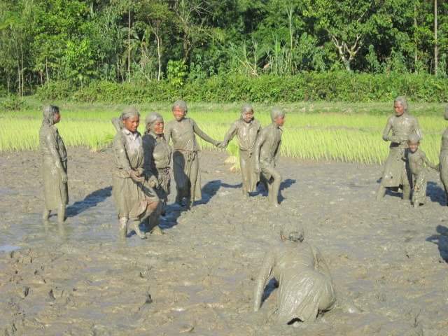 ‘প্যাঁক খেলা’ শেষে কাদা মেখেই নরম কাদায় বপন শুরু হয় ধান। এমনই সরল-সুন্দর-ঐতিহ্যময় হাজাং আদিবাসী জীবন।