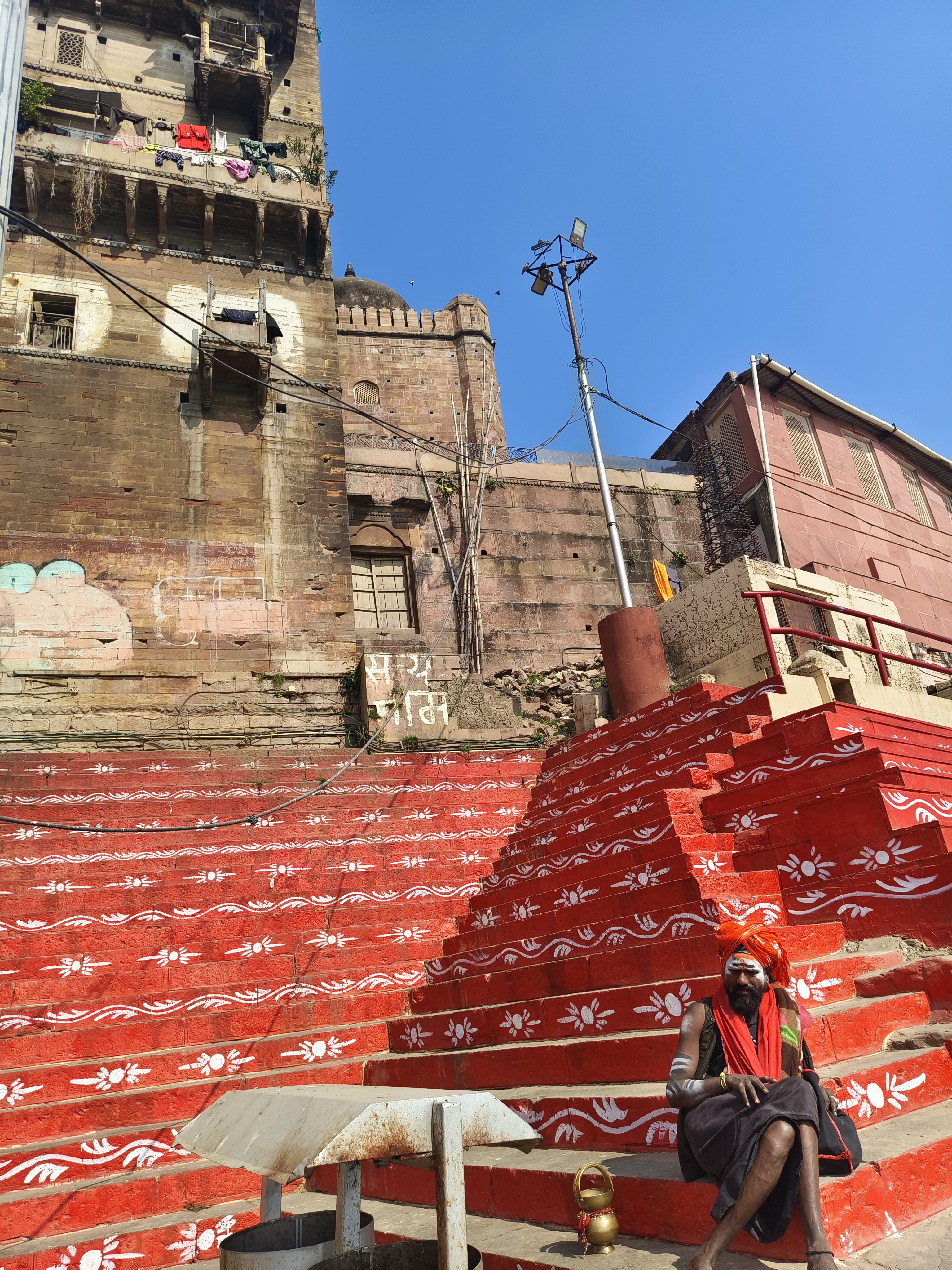 বিন্দুমাধব ঘাটের সিঁড়িগুলো দেখে মনে হল সোওজা গিয়ে একটা মন্দিরে ঢুকেছে।  ওই ঝাঁ ঝঁ রোদ্দুরে আর উঠে গিয়ে যাচাই করে আসতে ইচ্ছে হল না। বিন্দুমাধবের পাশের ঘাটের নাম পঞ্চগঙ্গা ঘাট। কিন্তু সেখানে একটা বড় বোর্ড লাগান, যাতে লেখা এ ঘাটের নাম আগে ছিল হিন্দুমাধব ঘাট। সবে মনে হয়েছে  এ বোধহয় বিন্দুমাধবের ভাই অথবা বাবা, অমনি ভুল ভাঙিয়ে নীচে লেখা এখানকার বিষ্ণুমন্দিরের নামে নাম ছিল।  পরে গঙ্গার পাঁচটি পবিত্র উপনদী এখানে গঙ্গায় মিলিত হয়েছে, সেজন্যই ঘাটের নাম পঞ্চগঙ্গা। কোথায় সে উপনদীরা কে জানে! তাদের খুঁজে টুজে পাওয়া গেল না। সিঁড়ির কোণায় এক সাধুবাবা ‘'বাবার পেসাদ’ পেয়ে ঝিম ধরে বসে আছেন।