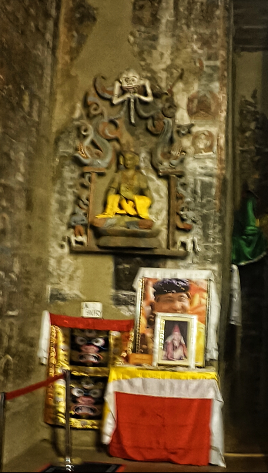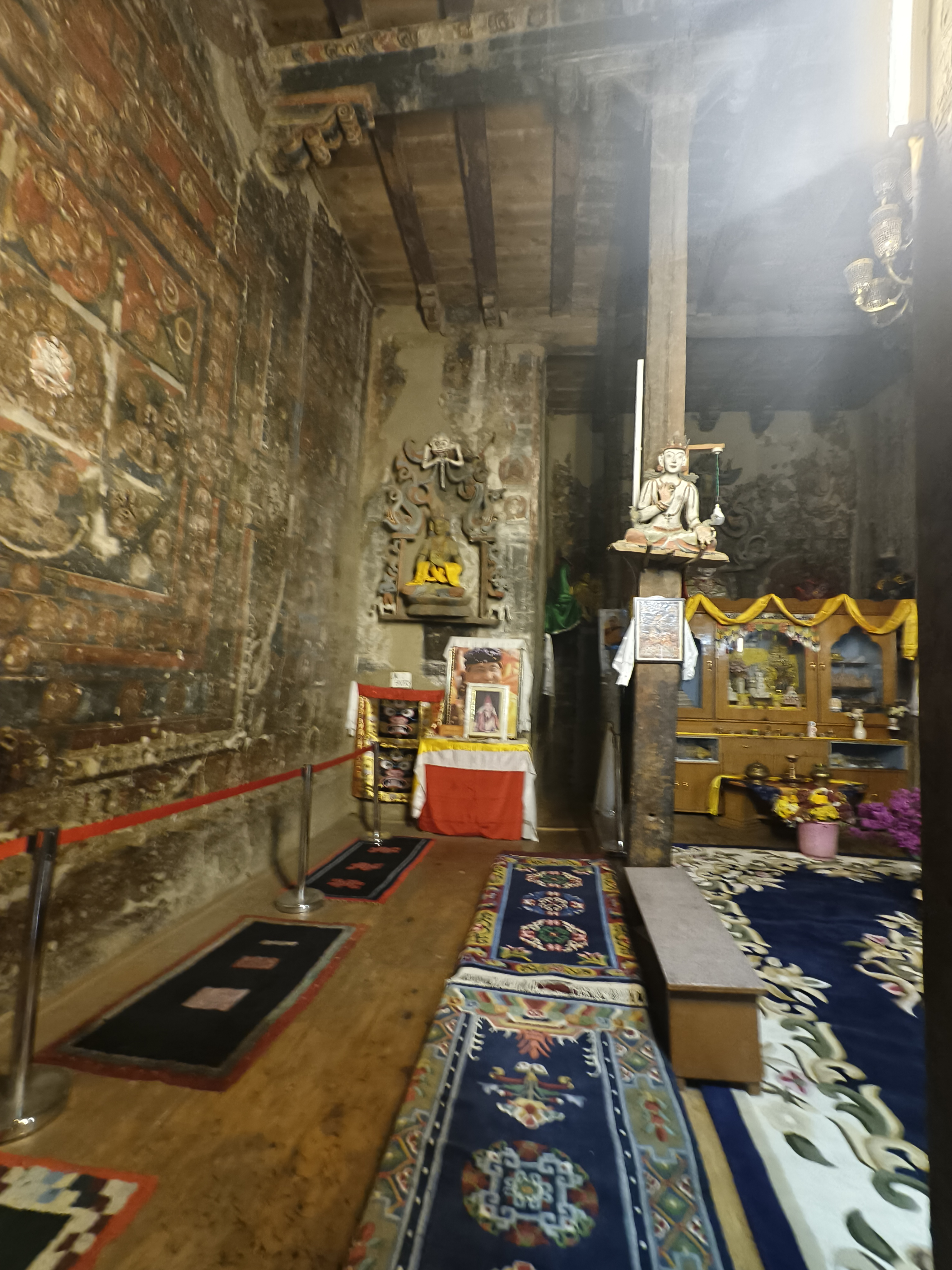 বাইরে থেকে বেশ বড় দেখালেও যেটিতে ঢুকতে পেরেছি সেটা ছাড়া বাকী তিনটে হল কোথায় বুঝতে পারি নি। মানে পাশে অন্য কোন দরজা দেখি নি। যে হলটিতে ঢুকেছিলাম অন্যান্য প্রাচীন গোম্পার মতই সেটিরও চৌকাঠ উঁচু এবং দরজার মাথা খুবই নীচু। ফলে নিজের মাথার দিকে খেয়াল রেখে মাথা নীচু করে না ঢুকলে গুঁতো খাওয়া অনিবার্য। ভেতরে আলো আছে তবে টিমটিমে। অনেক উঁচুতে একটা জানলা দিয়ে আসা সূর্যরশ্মি সোজা পড়েছে রিঞ্চেন জাংপোর মূর্তির মাথায়।