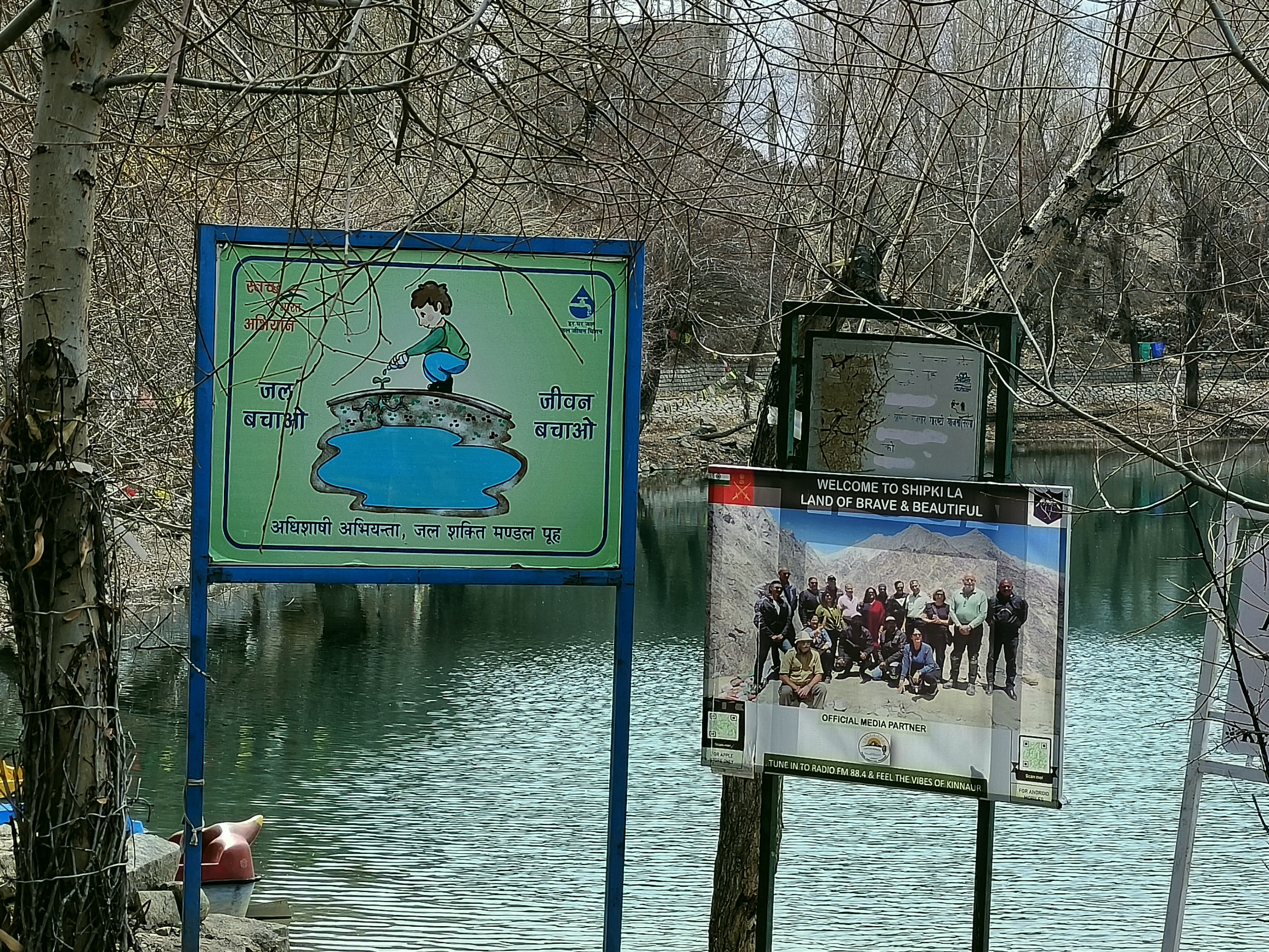 সিঁড়ি শেষ হবার পরে অবশ্য অসমান বোল্ডার এবং ভেজা থকথকে কাদামাটি। বোঝাই যাচ্ছে জল এই পর্যন্ত আসে। উপর থেকে সিঁড়ির পাশ বরাবর বেশ তীব্রগতির এক জলধারা নেমে এসে লেকে মিশেছে। এ কি নাকো গ্রামের পয়:প্রণালীর জল নাকি উপরে পাহাড়ের কোন জলের উৎস থেকে আসছে? এদিকে লেকের পাড়ে Welcome to Shipki La বোর্ড লাগিয়ে গেছে কারা। কেন রে বাপু! স্বাধীনতার পরে এই বছরই প্রথমবার শিপকি লা খুলে দেওয়া হয়েছে বটে পর্যটকদের জন্য। কিন্তু সে তো এখানে নয়।