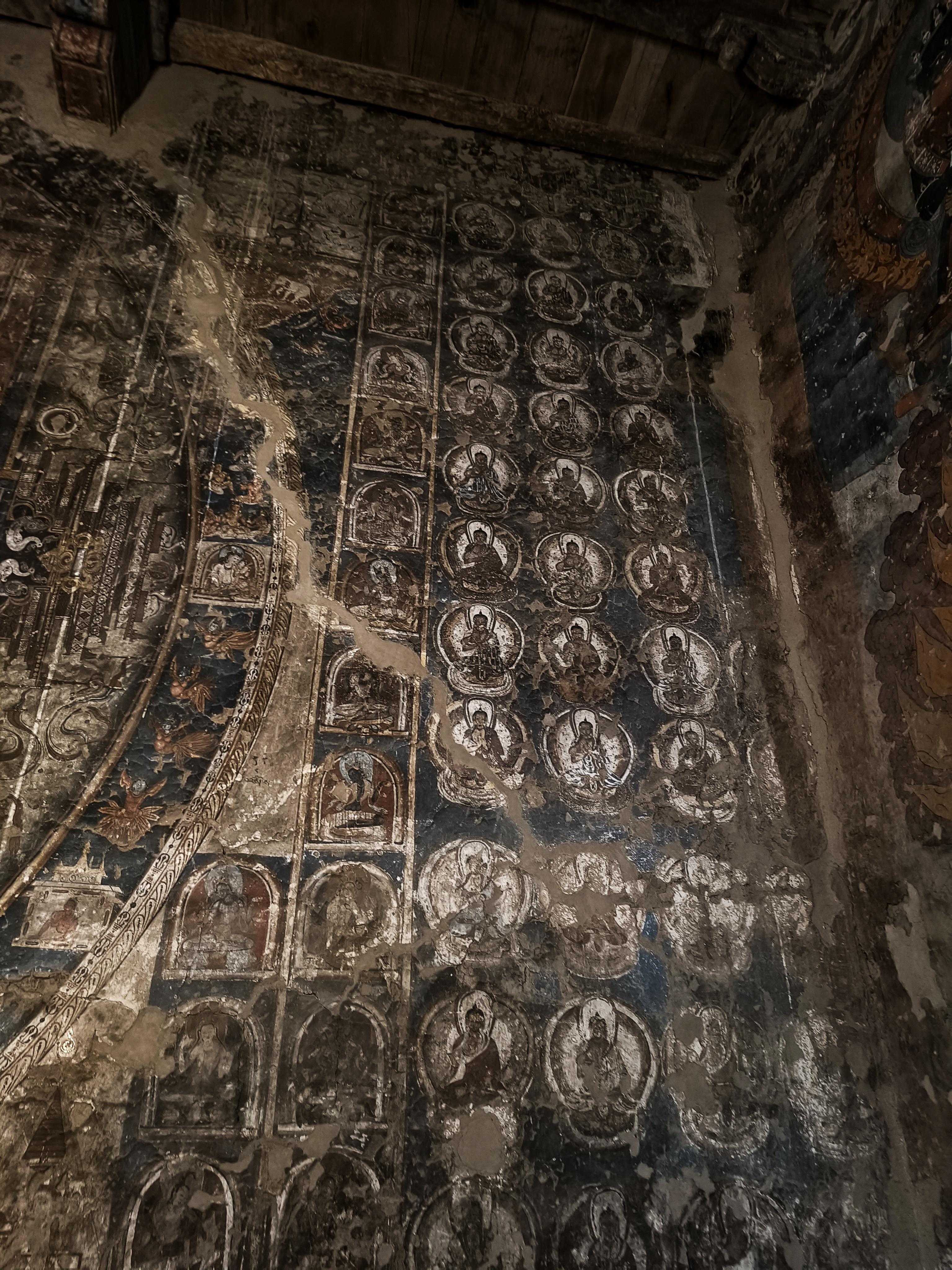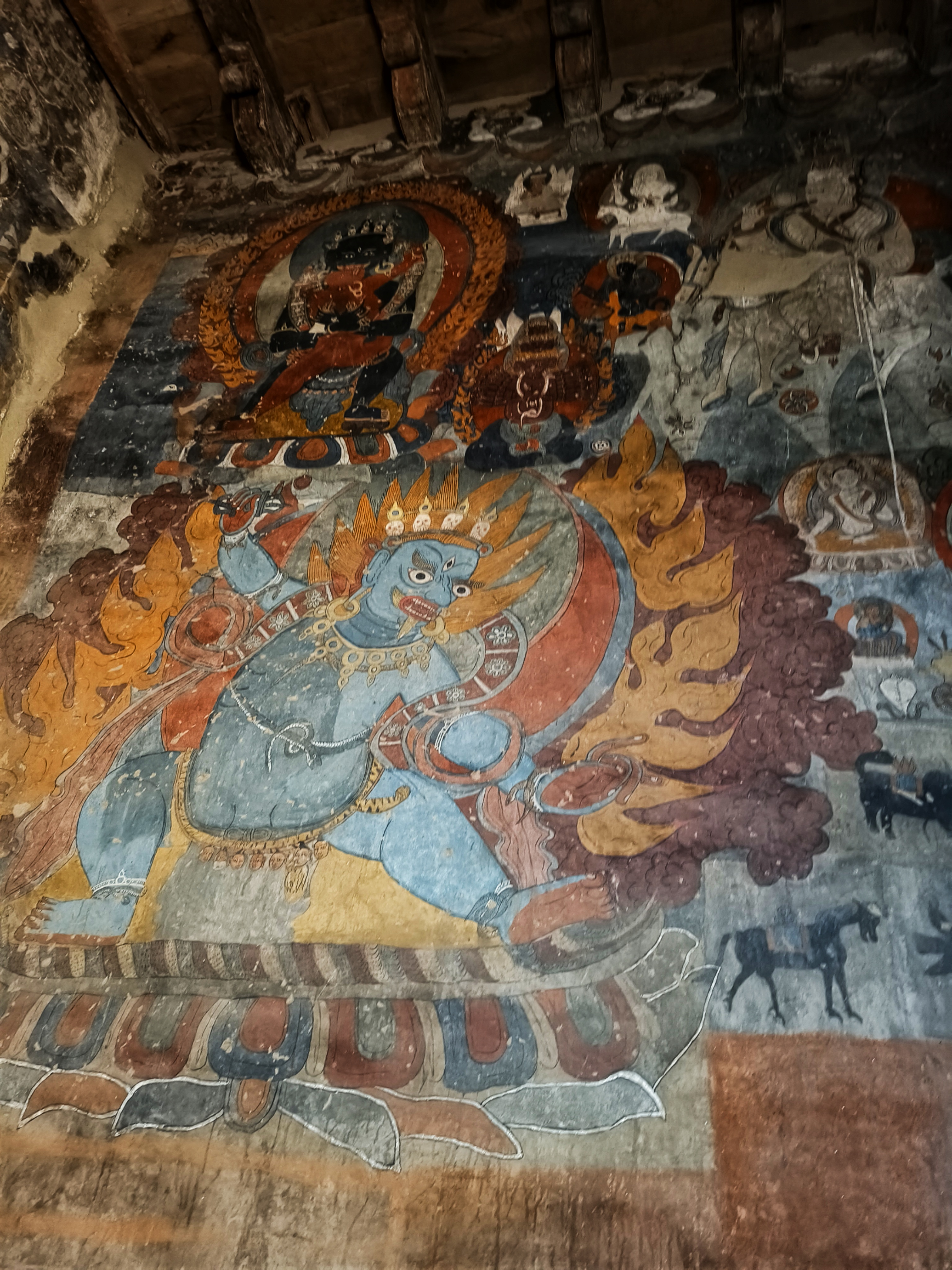 সবকটা দেওয়াল জুড়েই বর্ণাঢ্য দেওয়ালচিত্র। হলদে তারার মূর্তি এখানে আছে নেটে দেখে গিয়েছিলাম। চিহ্নিত করতে পেরে ভারী আনন্দ হল। এদিকে জুতো খুলে ঢোকার সময় মোজাও খুলে এসেছি। হাজার বছরের প্রাচীন পাথরের মেঝে থেকে উঠে আসা ঠান্ডা খালি পা বেয়ে গোটা দেহই জমিয়ে দিতে চায়। গোটা ঘরে আর কেউই নেই, বাইরেও ইমনবাবু ছাড়া আর কেউ নেই। দেওয়ালচিত্রগুলো বুঝিয়ে দেবার কেউ থাকলে ভাল হত। হয়ত উৎসবের সময় বাকী হলগুলো দেখা যায়।