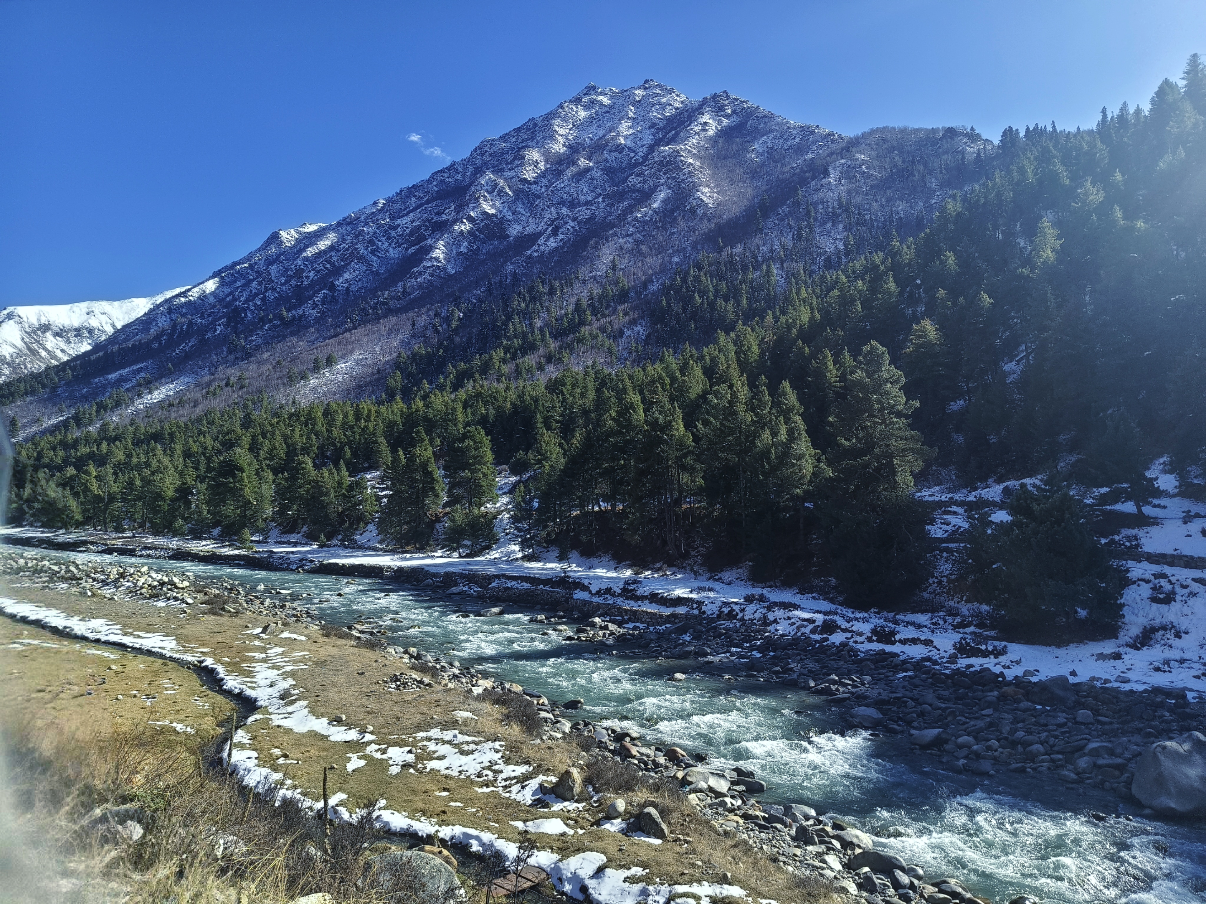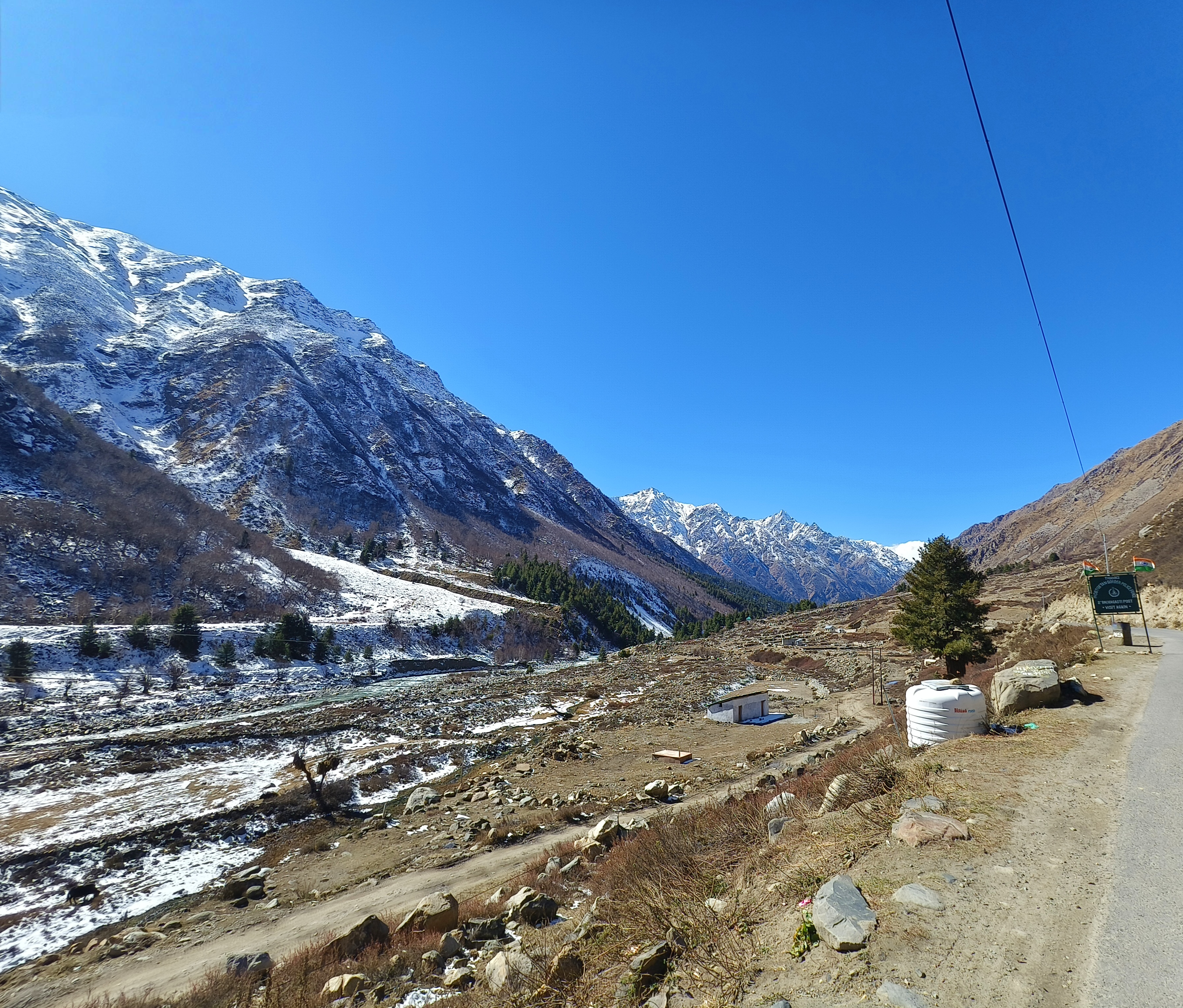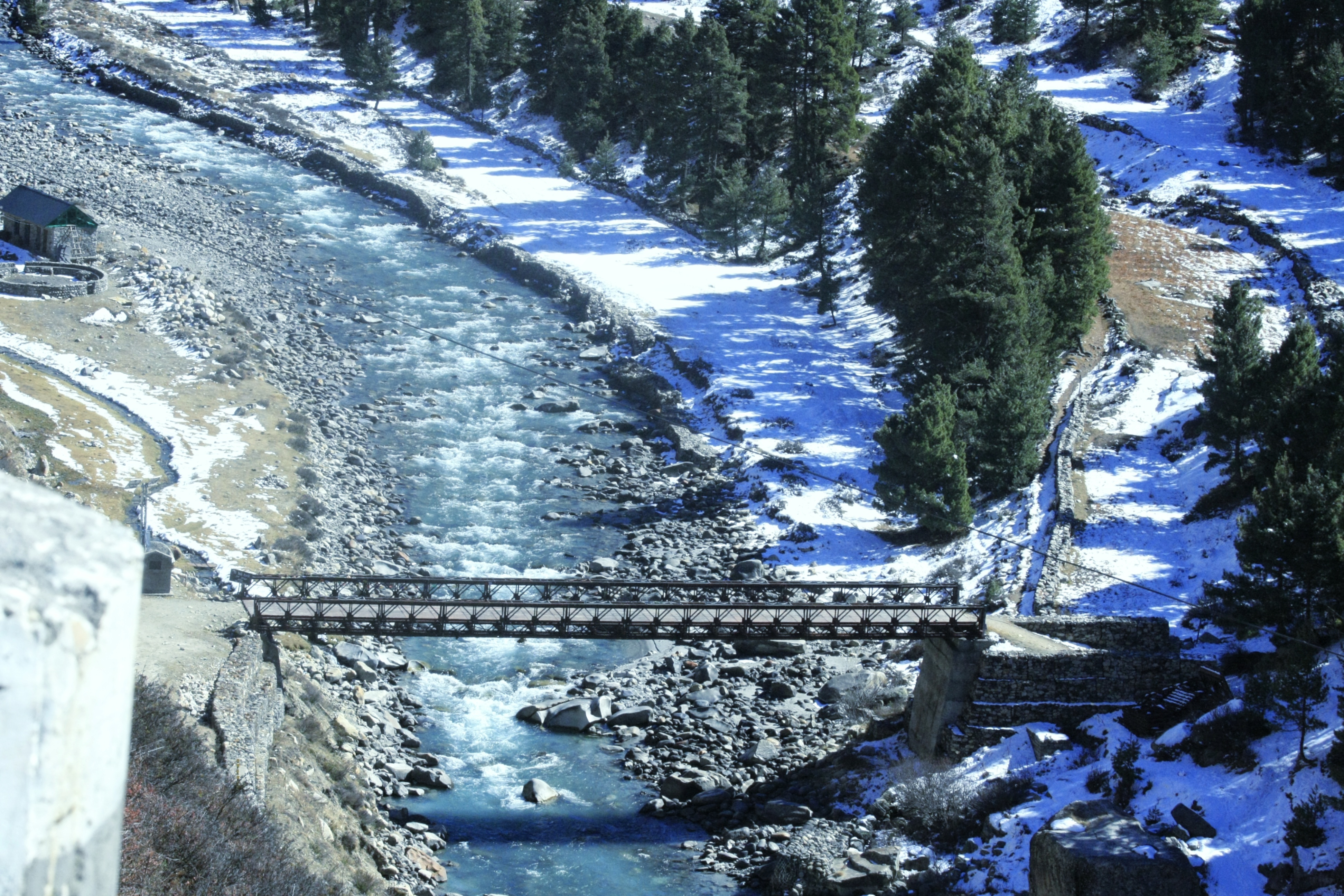 BSNL এর সিগনাল আছে, AQI চেক করে দেখলাম ৫। দিল্লি অঞ্চলে তখন ৫৫০ থেকে ৬৫০ চলছে। নদীর ধারঘেঁষা ক্যাম্পগুলো এ বছরের মত পাট গুটিয়ে চলে গেছে। রাস্তা থেকে বেশ অনেকটা নীচে নদী, ওওই দূরে নীচে একটা ব্রিজ দেখা যাচ্ছে ওপারে যাবার। কিন্তু ব্রিজ অবধি পৌঁছাবার কোন রাস্তা দেখা গেল না। সম্ভবত রিভারবেডে নেমে ছোটবড় বোল্ডার,  নুড়িপাথরের উপর দিয়ে হেঁটে পৌঁছাতে হবে। তবে এই যে কিছু ভ্লগার ছিটকুলে এসে বসপার ধারে দাঁড়িয়ে ক্যামেরা তাগ করে বলে ওই দেখুন ওপারের পাহাড়গুলো তিব্বত, সেটা একদম ডাহা গুল।
