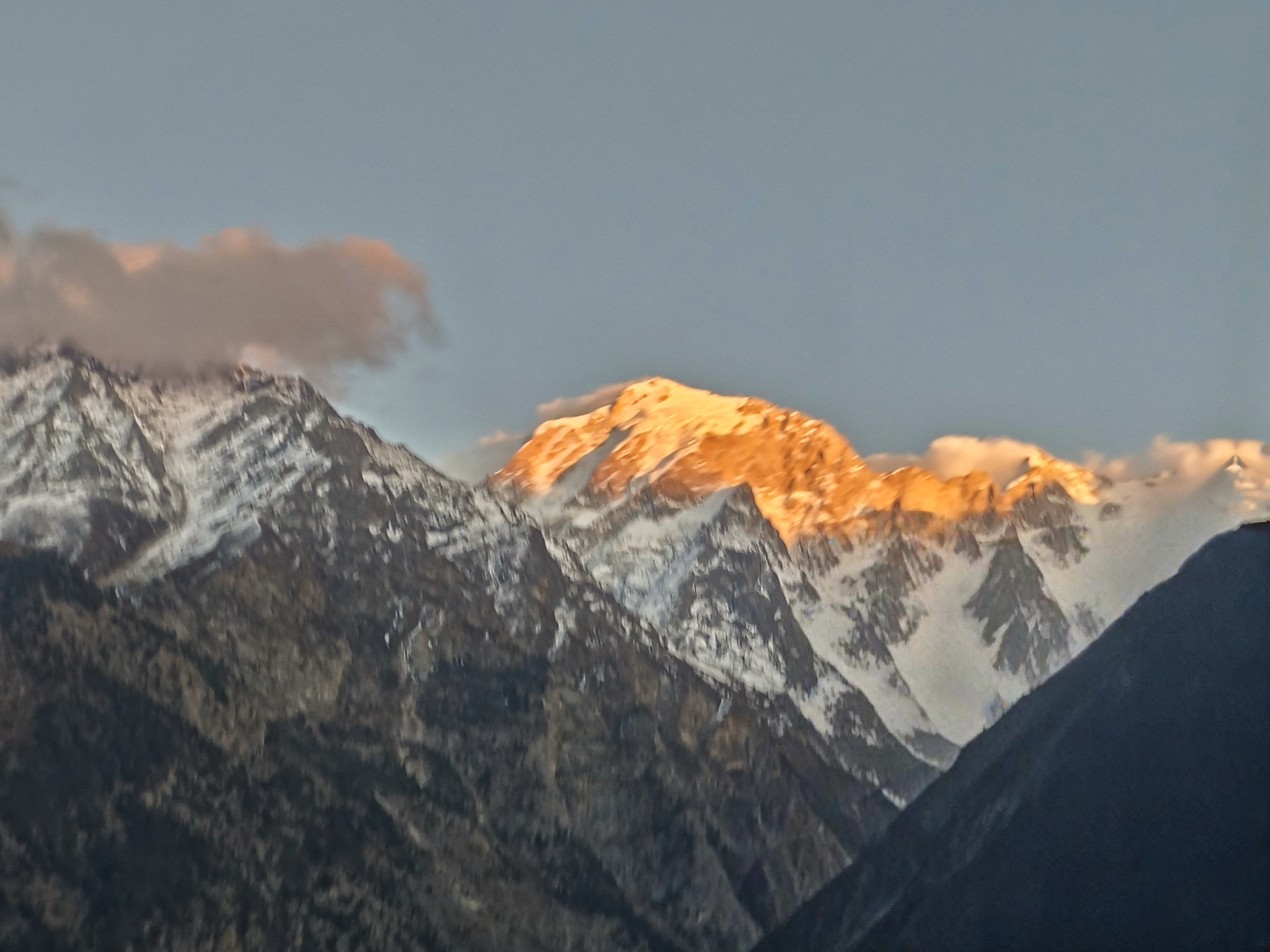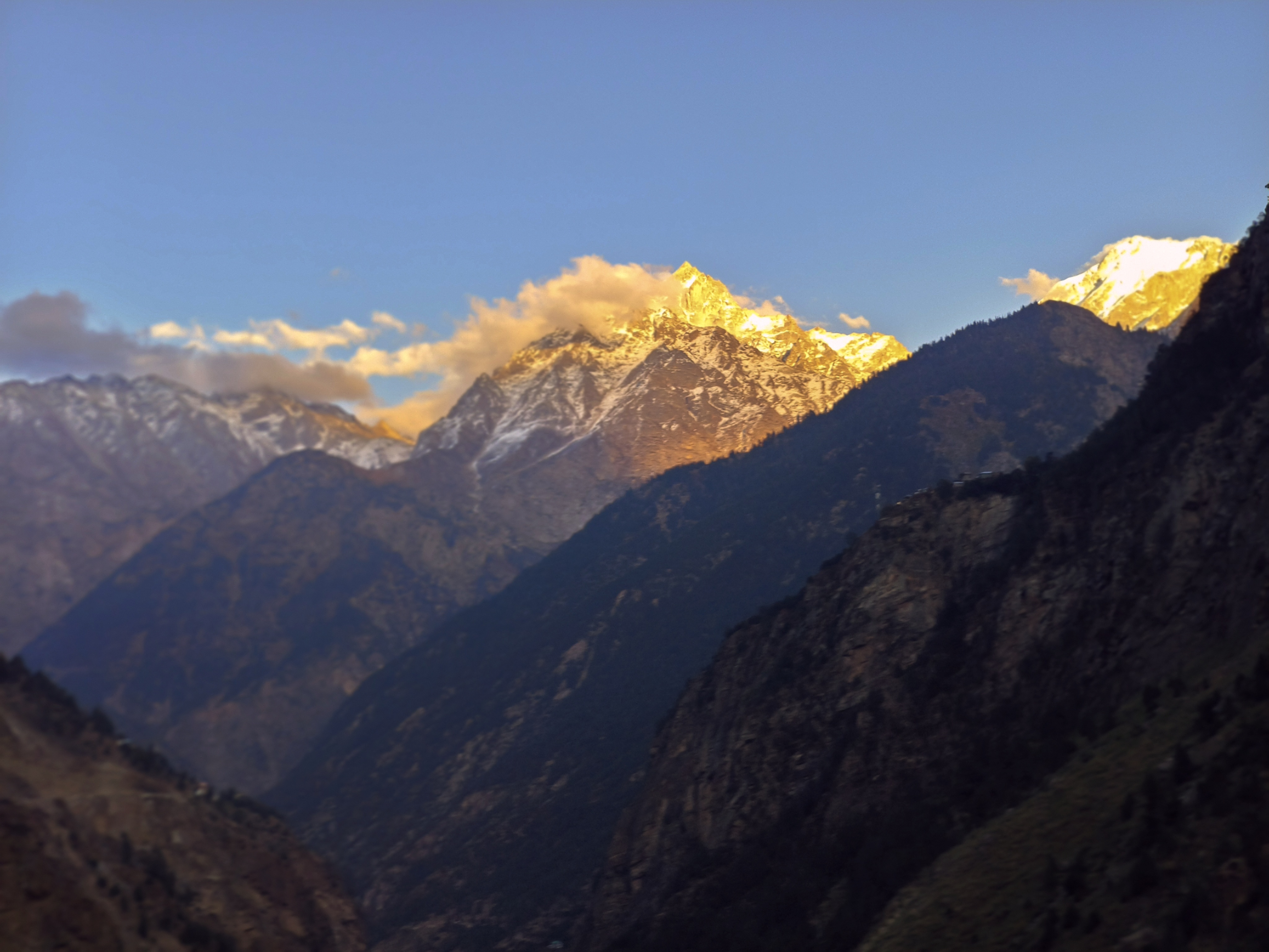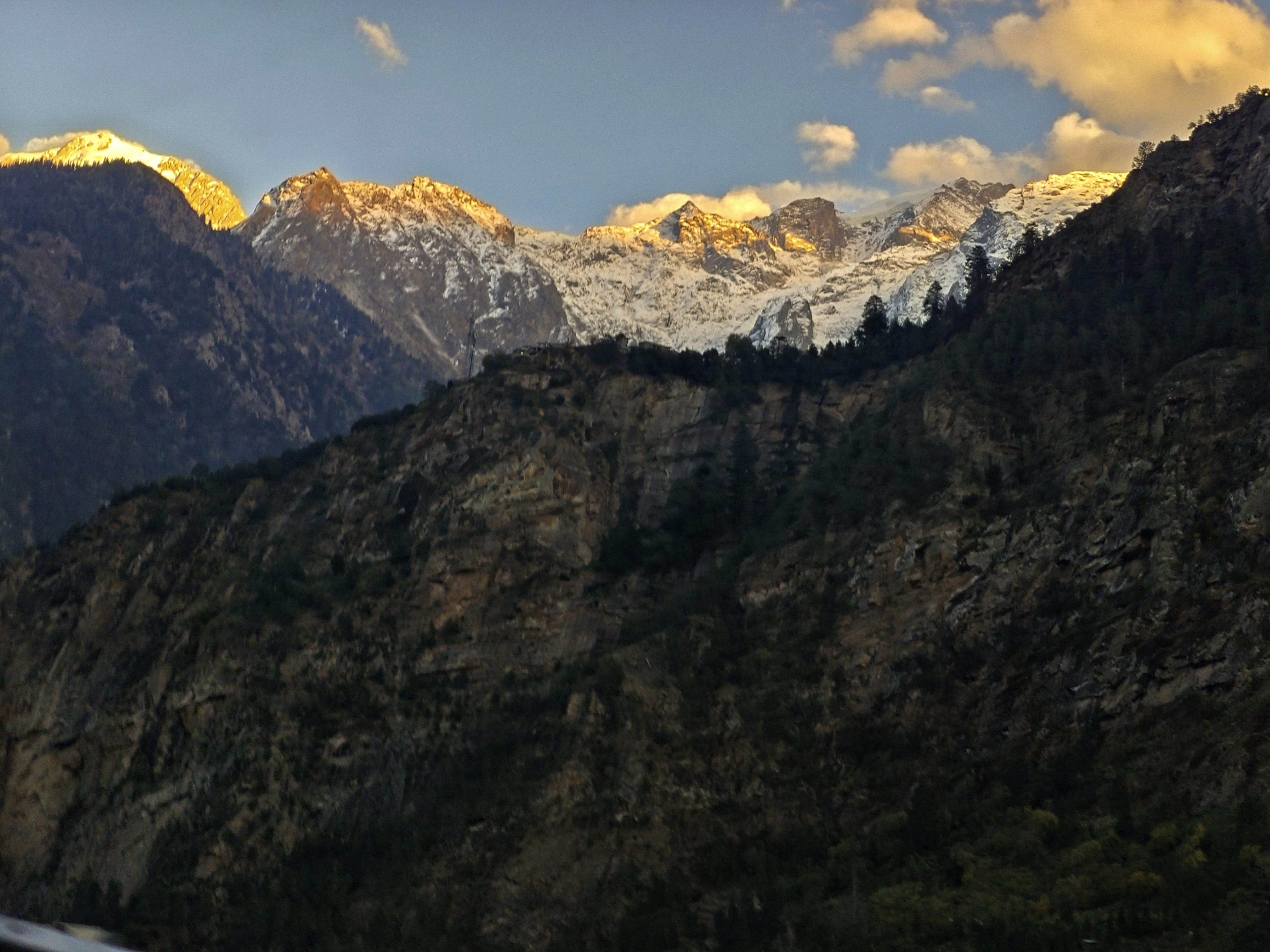 কিন্তু রাস্তা…  সেই ভাঙাচোরা এবড়ো খেবড়ো রাস্তায় চারটে নাগাদ বেরিয়ে ছটার আগে পৌঁছানো কিছুতেই সম্ভব হয় না। সাংলা পেরিয়ে সেই পাথর সরানো পয়েন্টেও মিনিট পনেরো দাঁড়াতে হয়। আলো কমে আসছে দ্রুত। নীচে নদীর দুপাশে ঝুপসি আঁধার। রওলা ক্লিফ বাদ দিই আমরা, কাল সকালে সিমলা ফেরতের সময় দেখে যাবো। আমাদের চলার পথও ঝাপসা হয়ে আসছে ক্রমশ।  বাঁকে বাঁকে উঁকি দিয়ে যাওয়া কৈলাসের মাথায় তখনো সোনারঙা রোদ্দুর।