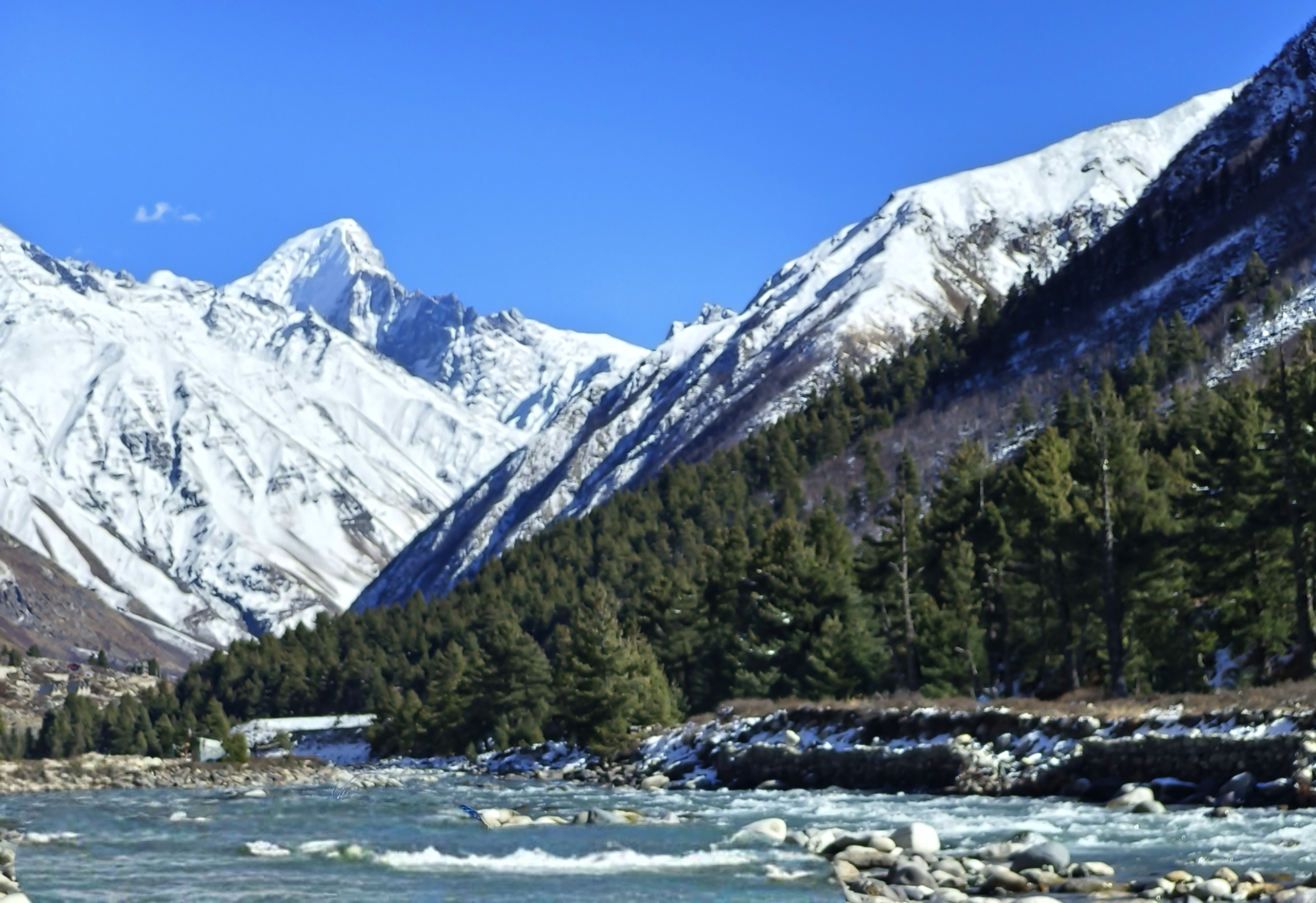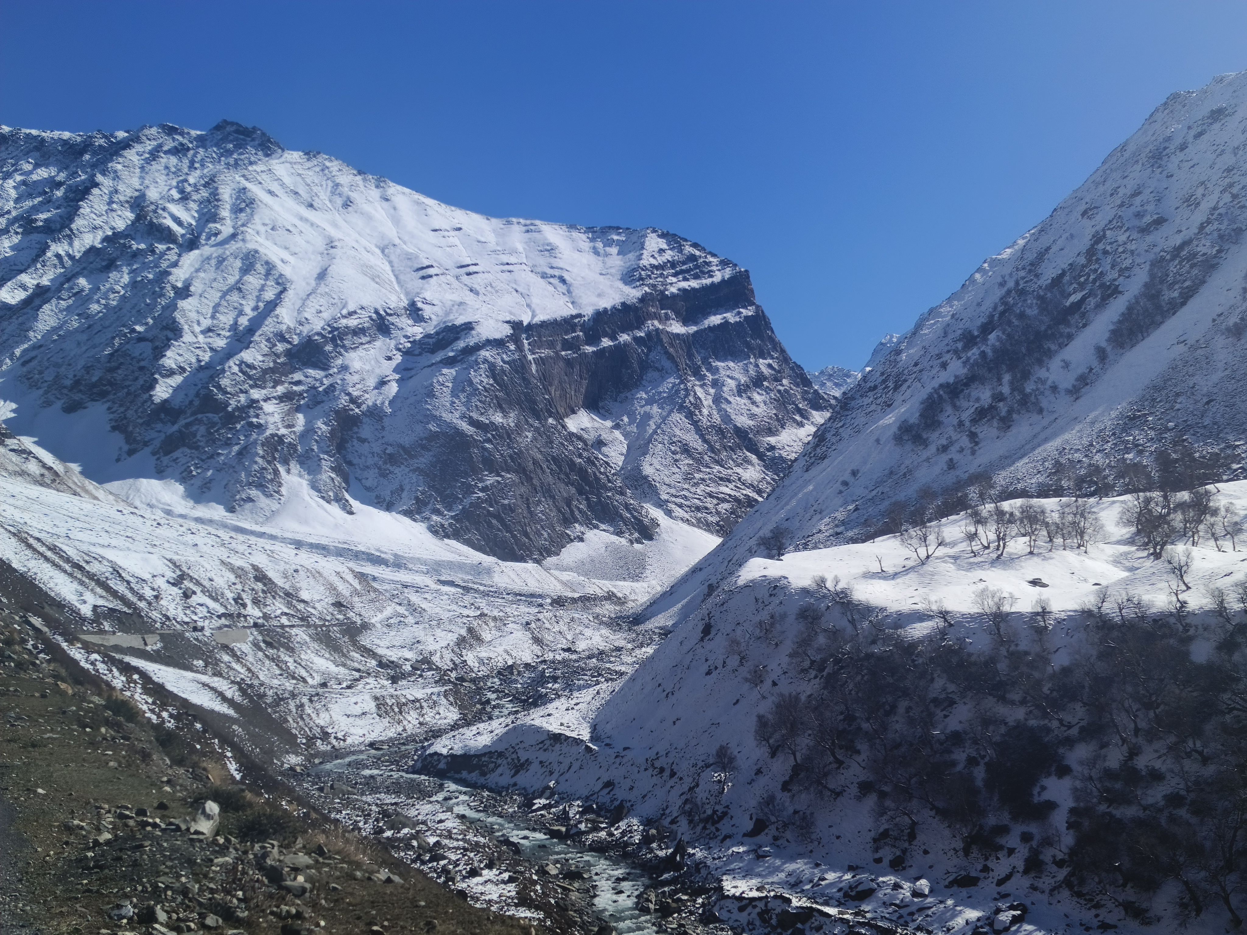 রেকংপিও ছাড়িয়ে গাড়ি এগোয় NH505a হয়ে NH5 ধরা। রাস্তা ক্রমশই ভাঙাচোরা হতে শুরু করল। করচাম ড্যামের ওখানে বসপা এসে মিলেছে শতদ্রুর সাথে। এখান থেকে আমরা হাইওয়ে ছেড়ে ঘুরে গেলাম সাংলা ছিটকুল রোডে। রাস্তা আরো খারাপ হল। এক জায়গায় রাস্তা আটকে পাথর সরানোর কাজ চলছে। দুপাশে বেশ কিছু গাড়ি জমা হলে কাজ থামিয়ে এক এক করে ছাড়ে গাড়ি।  আমনের সাথে টুকটাক গল্প করতে করতেই আমরা পোঁছাই সাংলা।  একটা ভিউ পয়েন্টে থেমে কিছুক্ষণ ছবি তোলা হয়।
