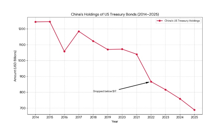 এখানে আরো একটা কথা বলা যায় চীন গত একদশকের বেশী থেকে নিজের আম্রিকি ট্রেজারী বন্ড হোল্ডিং অনেকটাই কমিয়ে দিয়েছে যাতে দেখা যাচ্ছে ২০২৫ সালের শেষে এই গত সতেরো বছরের মধ্যে সবথেকে কম ছিল চীনের টোটাল আম্রিকি ট্রেজারী বন্ড হোল্ডিং | ২০১২ সালে যেখানে আম্রিকি ট্রেজারী বন্ড সবচেয়ে বেশি ছিলো চীনের কাছে যে পরিমাণ এক ট্রিলিয়নে ডলারের থেকেও বেশী ছিল এখন সেটা প্রায় ৫০০ বিলিয়ন ডলার কমে ৬৮০ বিলিয়ন ডলারের মতো | ওদিকে আম্রিকার অর্থনীতি ধার ছাড়া চলবেনা এবছর হয়তো সে ধার ছাড়িয়ে যাবে ৪০ ট্রিলিয়ান ডলার আর বছরের মোট debt payment ১ ট্রিলিয়ন ডলারের বেশি হবে যেটির মানে এখন থেকে আম্রিকার বাৎসরিক মিলিটারী বাজেটকে তার annual debt payment ছাড়িয়ে যেতে পারার সম্ভাবনা !! পৃথিবীর সব সাম্রাজ্য এরকম সময়ে তাই করে যেটা এখন আম্রিকা করেছে অর্থাৎ আরো সাম্রাজ্য বিস্তার !!!