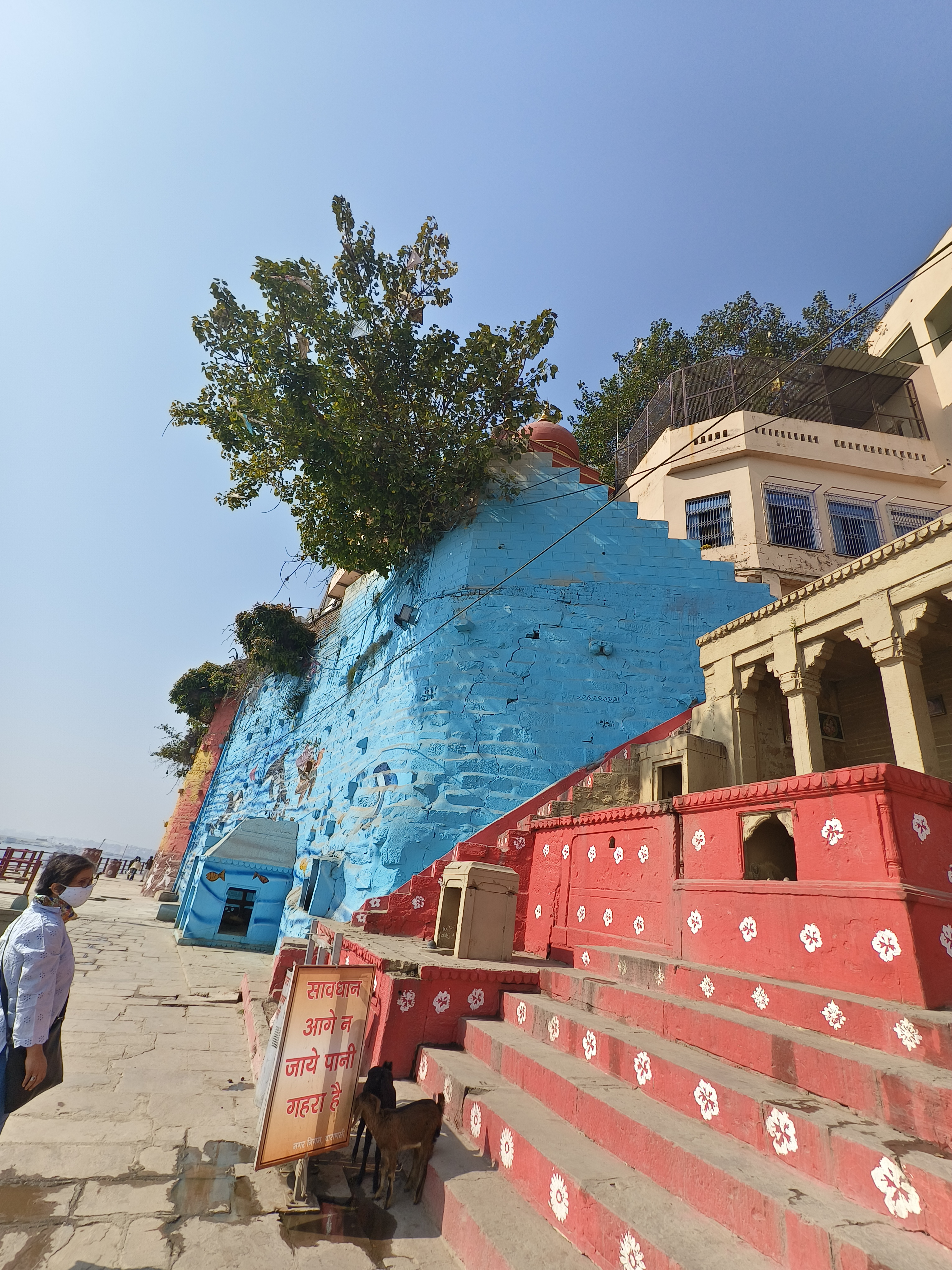 এইদিকের ঘাটগুলো মোটের উপর শান্ত। কিছু লোক স্নান করছেন, কেউ বা এমনিই বসে আছেন চুপচাপ। নৌকো ঘাটে লাগিয়ে খদ্দেরের আশায় মাঝি সায়েবরা ঘুরে বেড়াচ্ছেন ঘাটের সিঁড়িগুলোতে।  সম্ভাব্য মক্কেল দেখলেই খপাৎ।  কোন কোন ঘাটের একপাশে রেলিং দিয়ে ঘিরে ভিউ পয়েন্ট মত করা। চারণিক পর্যটকেরা সেখানে  দুদন্ড দাঁড়িয়ে ছবি তুলে নিচ্ছেন। শীতলা ঘাটের পরের ঘাটের পাশে  কটকটে নীল রঙের দুর্গের মত কিছু একটা বানানো। ওই নীল দেওয়ালে নানা ছবি আঁকা। খানিকটা খুঁজেপেতে নামটা বের করা গেল বুন্দিপারকোটা  ঘাট।