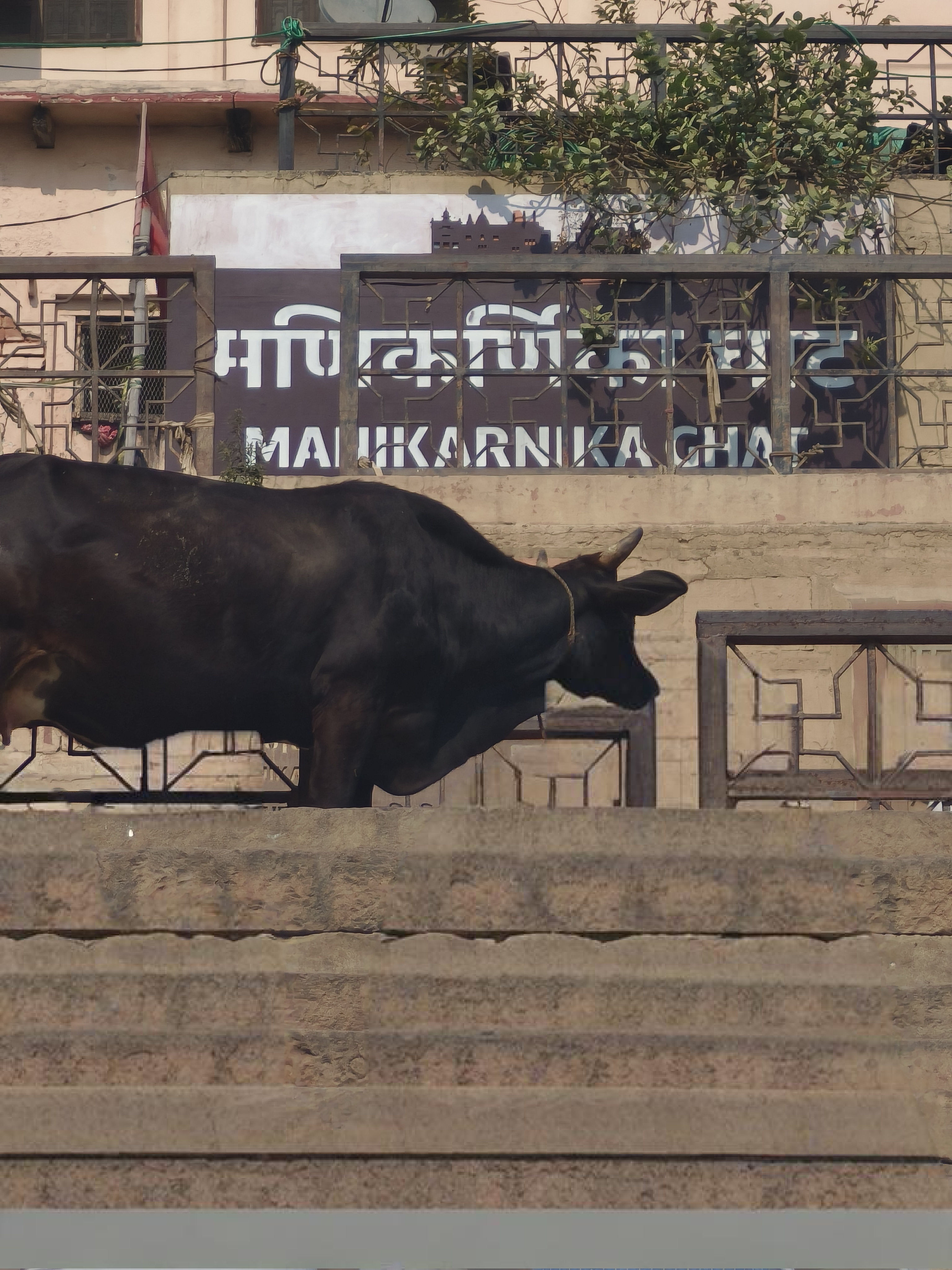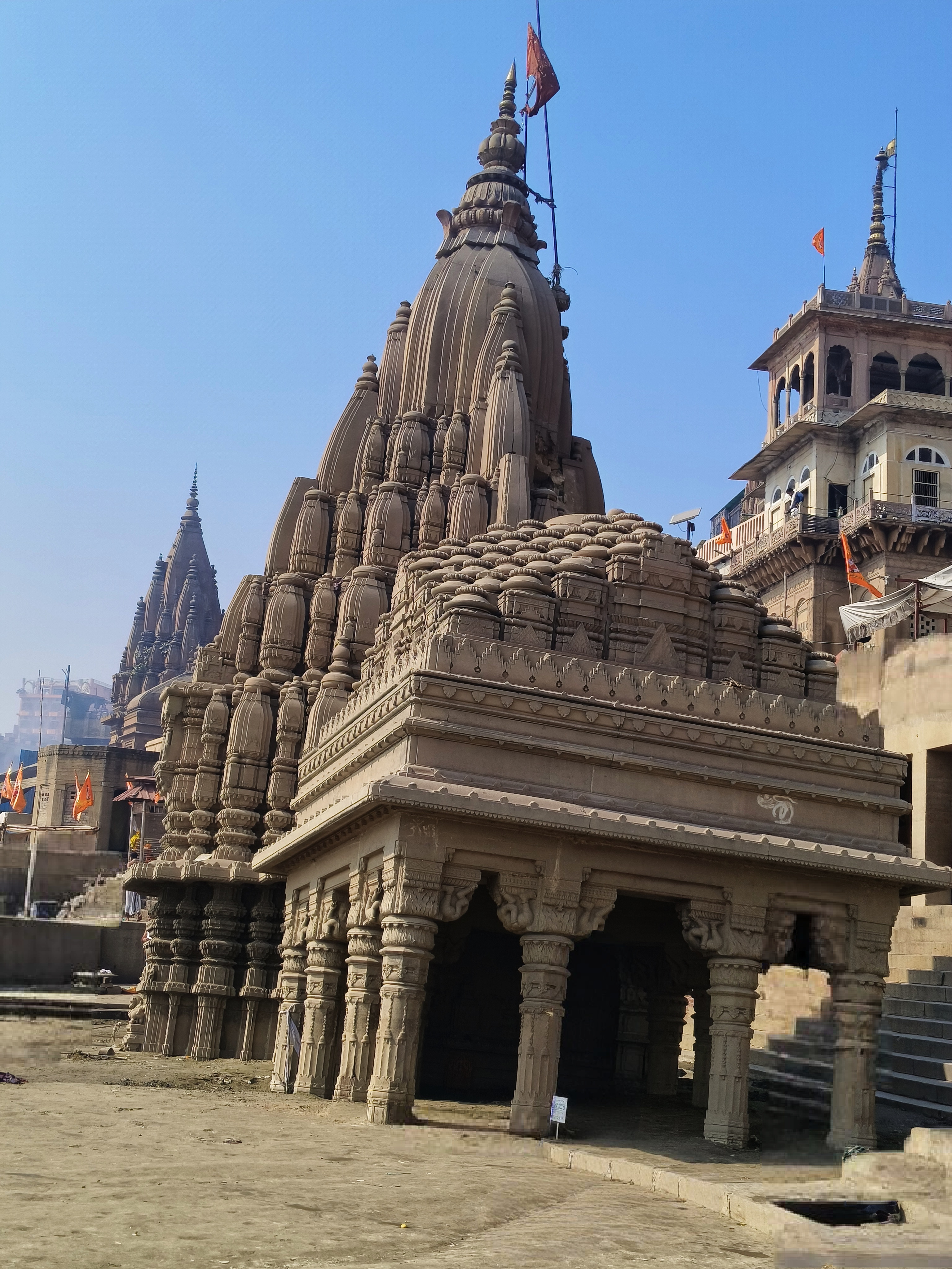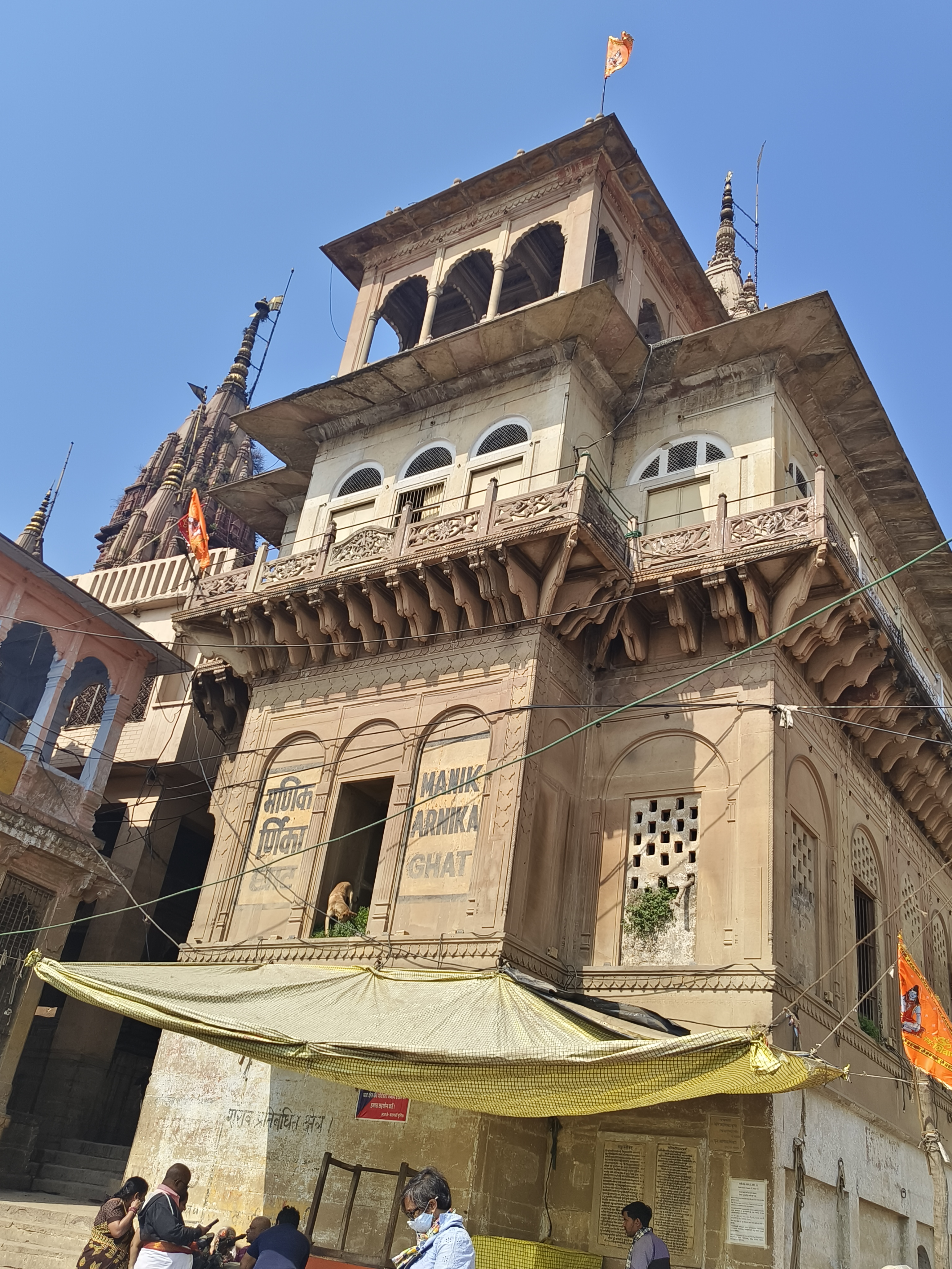 পুরাতাত্ত্বিক তথ্য প্রমাণ বলে মন্দিরটি ১৮৬০ নাগাদ বানানো এবং বছরের অনেকটা সময় জলে ডুবে থাকার কারণে একদিকে হেলে গেছে। এর পরেই বিখ্যাত মণিকর্নিকা ঘাট, এখান থেকেই দিব্বি ধোঁয়া দেখা যাচ্ছে। সিন্ধিয়া ঘাটের একপাশে  চওড়া ধাপে একদল নারী পুরুষ বসেছেন শ্রাদ্ধ করতে।  পোষাক, পুরুষদের ধুতি পরার ধরণ দেখে মনে হল দক্ষিণ ভারত থেকে এসেছেন। ভারতের নানাপ্রান্ত তো বটেই পৃথিবীর নানা প্রান্ত থেকেই মৃত মানুষ নিয়ে আসে মণিকর্ণিকায় দাহ করাতে। পরিবেশকে দুহাতপায়ের চারখানা বুড়ো আঙুল দেখিয়ে কাঠের চিতায় চলে দাহকাজ। চব্বিশ ঘন্টা তিনশো পঁয়ষট্টি দিন কখনো চিতা নেভে না এখানে।