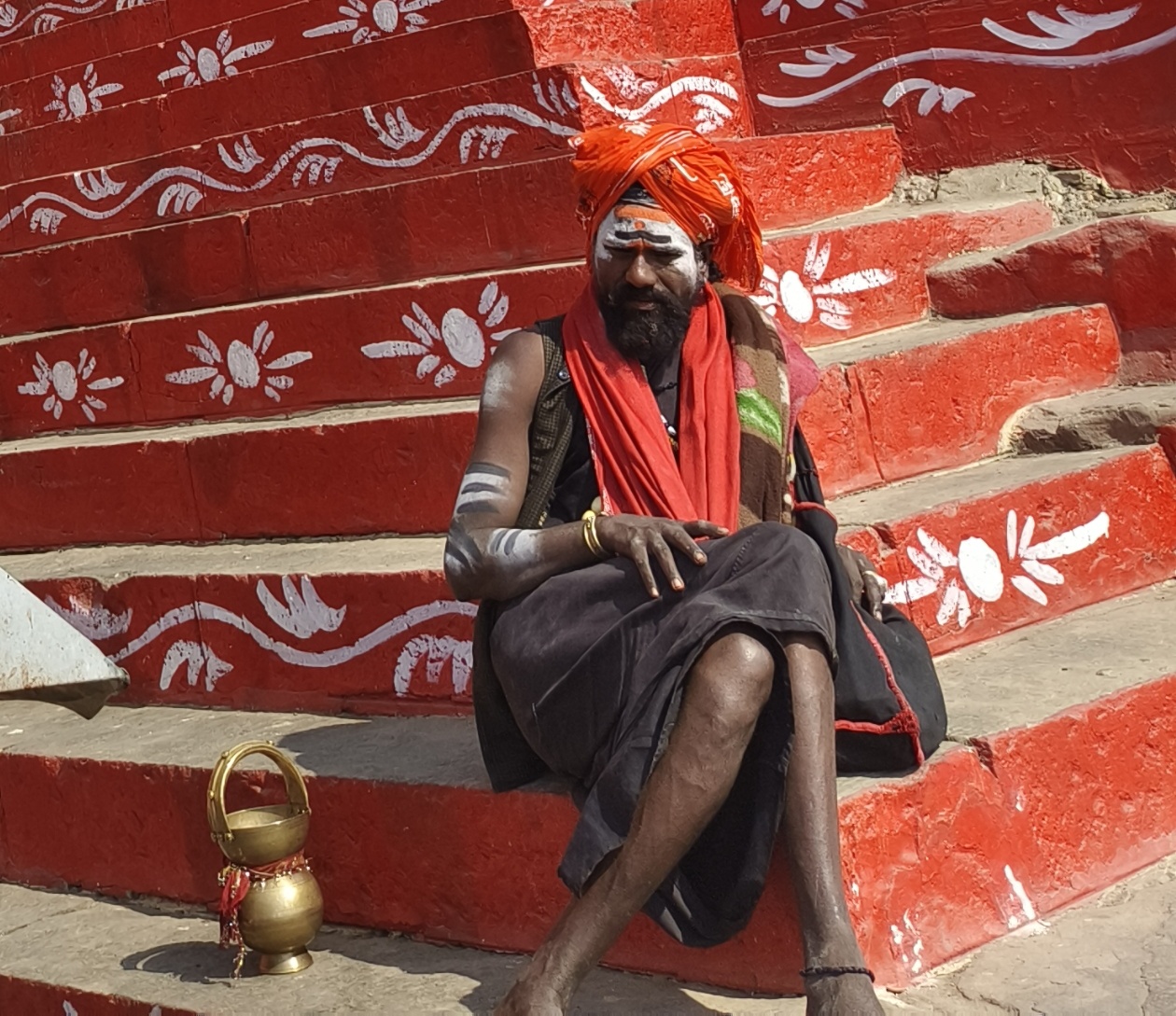 এমনিতে সাধুবাবারা আশীর্বাদ দেবার জন্য ঘুরে বেড়ায়। আশীর্বাদের রেট শুরু ২০টাকা থেকে। আশীর্বাদ নিতে না চাওয়ায় এক সাধুবাবা কিঞ্চিৎ আগ্রাসী ভাব দেখাতে দুই দাপুটে দুপাশ থেকে কটমট করে তাকাতেই সাধুবাবা বিড়বিড় করতে করতে পিঠটান দেন।  তা আশীর্বাদ না নিয়ে ফোটো তুলতে চাইলেও ওনারা খুশী কারণ ফোটো তোলার মূল্য বোধহয় আরেকটু বেশী। অবশ্য সব সাধু না,  এই ঘাটে ঘুরে বেড়ানো সাধুদেরই এটা একটা রোজগারের পথ। যাই হোক পঞ্চগঙ্গা ঘাটের সাধুবাবা তখন এই জগতের বাইরে,  ছবি তোলাতুলির মত তুশ্চু ব্যপারে মাথা ঘামাতে নারাজ।