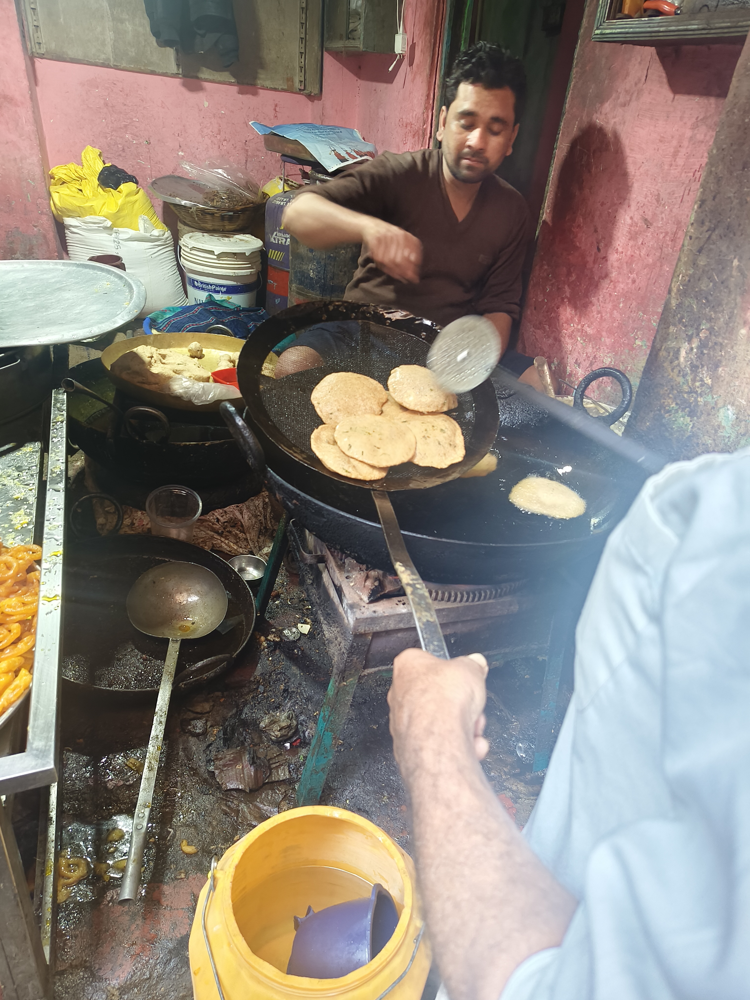 হোমস্টে থেকে বেরিয়ে গলিতে একপাক ঘুরলেই একখানা ছোটমত মন্দির, সংহারভৈরবের। ইনি কাশীর অষ্ট ভৈরবের একজন। অষ্ট ভৈরব হল গিয়ে শিবের আটখানা হিংস্র টাইপ রূপ যারা আটদিক রক্ষা করে। তো সংহার ভৈরব বেশ হিংস্রমতই দেখতে। বেলা দশটা নাগাদ বেরিয়ে দেখা গেল আরতি হচ্ছে সেই মন্দিরে। গ্রিলের বাইরে অল্প কজন ভক্ত  দাঁড়িয়ে দেখছেন।  আরো একটু এগিয়ে দুইপাক ঘুরে গাইঘাটে নামার গলিতে এক কচুরি জিলিপীর দোকান। গরমা গরম ভাজা হচ্ছে আর উড়ে যাচ্ছে। দুজনে মহা আহ্লাদিত হয়ে দাঁড়িয়ে পড়লেন।