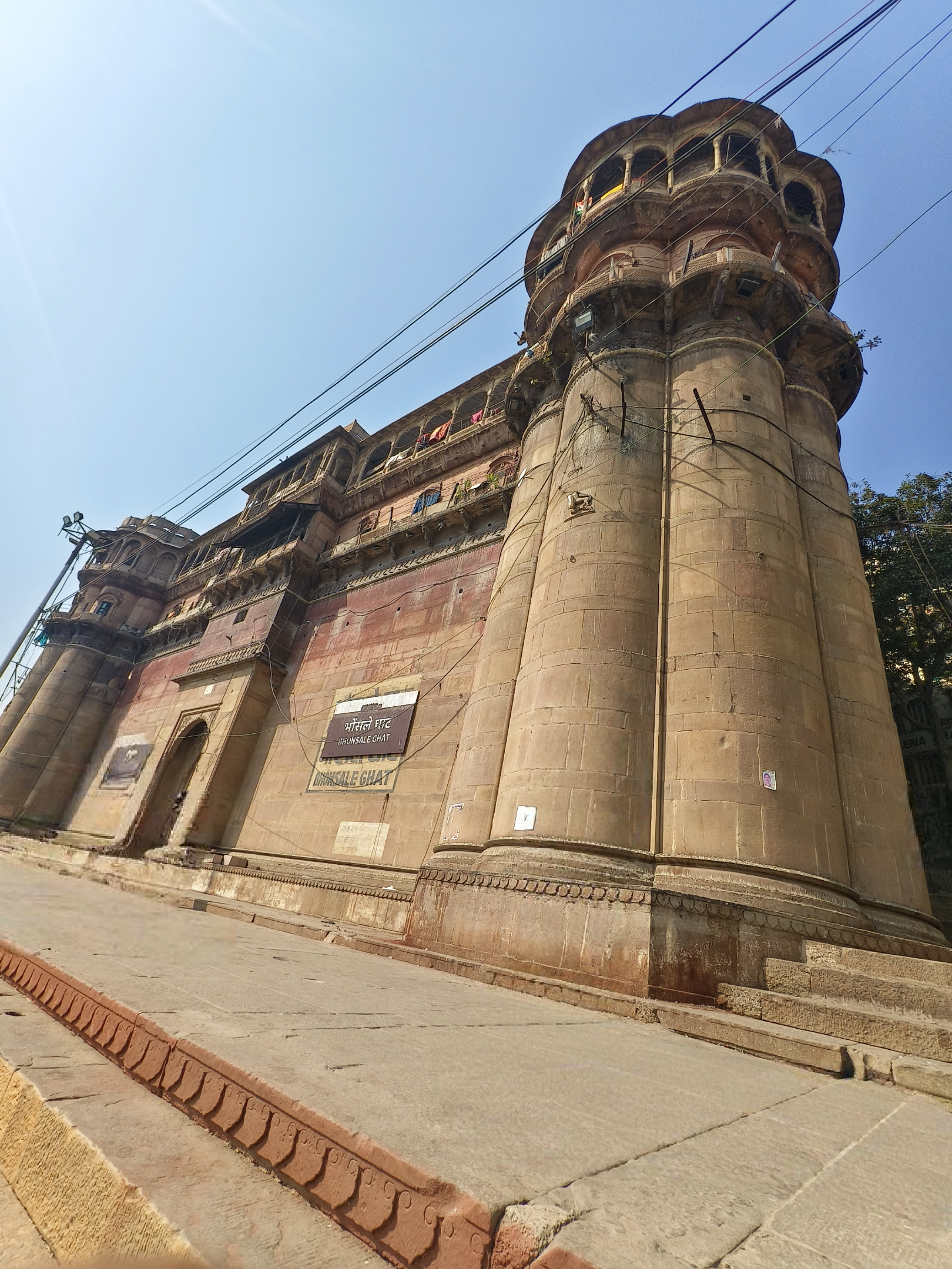 রাম ঘাট,  গনেশ ঘাট,  গোয়ালিয়র ঘাট ইত্যাদি আরো কটা ঘাট পেরিয়ে একটা ঘাটের উপরের স্থাপত্য দেখে কোন্নগর হঠাৎই উচ্ছসিত। আরে এ তো   মারাঠা দুর্গের মতভ  স্থাপত্য! কী ঘাট এটা? ভোঁসলে ঘাট। ওই দ্যাখো যা ভেবেছি ঠিক তাই। আরেকটু এগিয়েই সিন্ধিয়া  ঘাটে সেই বিখ্যাত রত্নেশ্বর মহাদেব মন্দির। ৯ ডিগ্রি কোণে হেলে থাকা এই মন্দিরের গর্ভগৃহ গোটা বর্ষাকাল জলে ডুবে থাকে। এই ফেব্রুয়ারীতে অবশ্য পুরোই দৃশ্যমান। প্রচলিত গল্প বলে এ মন্দির পাঁচশো বছর পুরোন, মহারাজ মানসিং (মতান্তরে তাঁর কোন কর্মী) মাতৃঋণ শোধ করতে চেয়ে মন্দিরটি বানান। মায়ের ঋণ যেহেতু শোধ করা যায় না তাই শিবের (নাকি অন্নপূর্ণার) অভিশাপে মন্দির হেলে যায়।