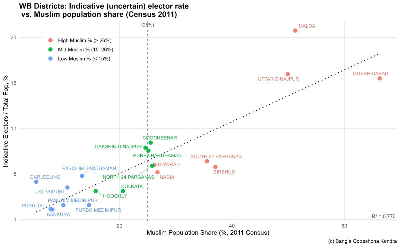 লেখচিত্রটা ভালো করে দেখুন। পশ্চিমবঙ্গের ৫০% বিধানসভায়ও এই পদ্ধতি অবলম্বন করলে তৃণমূলের জেতার আশা ক্ষীণ, সে যতই জনসমর্থন থাক না কেন। শুধু তৃণমূল কেন, মহম্মদ সেলিমও যতই জোট করে মুর্শিদাবাদ থেকে লড়ুন, জিতবেন তো নাই, জামানতও বাজেয়াপ্ত হবে, এতই নিখুঁত এই ডিজাইন। আর ওই ৬০ লক্ষ বিবেচনাধীন হলেন যুদ্ধের কোল্যাটারাল ড্যামেজ। তাঁরা বাংলাদেশ বা ডিটেনশন যেখানে খুশি যাবেন।