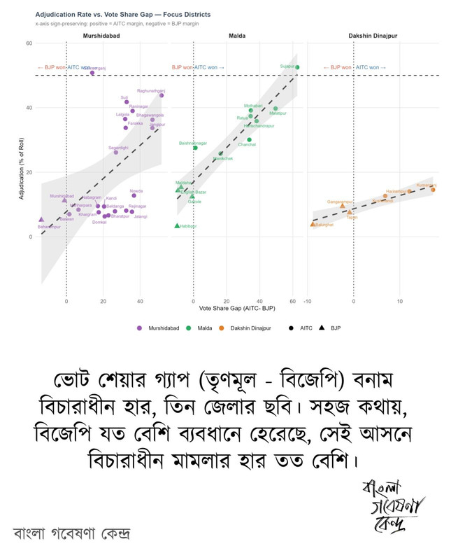 সব মিলিয়ে লক্ষ্যটা কীযে, মালদা, মুর্শিদাবাদ এবং দক্ষিণ দিনাজপুরে "বিচারাধীন"এর সংখ্যা এমন নিখুঁত হিসেবে তৈরি, যে, যেখানে ২০২১ এ তৃণমূলের যত ব্যবধান, সেখানে তত বিচারাধীন। সংখ্যাতত্ত্ব দিয়ে রাজ্যব্যাপীই এই প্রবণতাটা লক্ষ্য করা গেছে। অঙ্কের মোটামুটি হিসেবে যেকোনো বিধানসভায় ১% করে তৃণমূলের ব্যবধান বাড়লে .৫% করে "বিচারাধীন" বাড়ার প্রবণতা। এই সরলরৈখিক প্রবণতা খুব সহজ-সরল এমনি-এমনি হয়না। কোনো একটা গভীর ছক না থাকলে এ হওয়া প্রায় অসম্ভব।