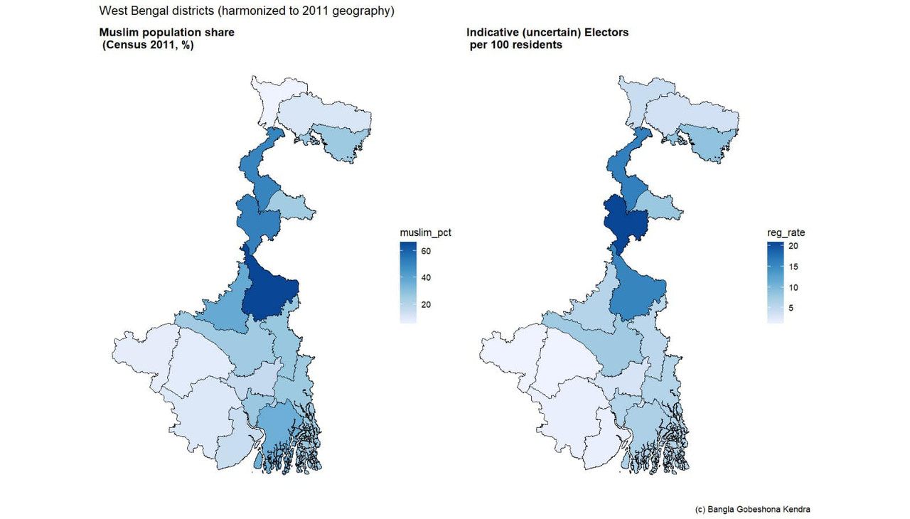 অবশ্য এটা প্রোজেকশন, নিখুঁত হিসেব না। এর মধ্যে পূর্বানুমান আছে, ১। ভোটের প্যাটার্ন ২১ থেকে অক্ষত আছে। ২। "বিচারাধীন"রা সবাই তৃণমূলের ভোটার। দুটোই হিসেবের স্বার্থে করা। কিন্তু খুব অকেজো পূর্বানুমান নয়। বিচরাধীনরা মুর্শিদাবাদ-মালদা-দিনাজপুরে মোটামুটিভাবে তৃণমূল ভোটার, এটা আন্দাজ করা যায়। কারণ সেখানে যাঁরা বাদ গেছেন, সংখ্যাগরিষ্ঠই সংখ্যালঘু। সেখানে সোজাসাপ্টা হিসেব। উত্তরবঙ্গ থেকে দক্ষিণে এলে বর্ধমান ছাড়ালেই প্যাটার্ন বদলাচ্ছে, লিস্টি থেকেই দেখতে পাবেন। সেটা কী, এই নিয়ে কাজ চলছে। হলে আবার লিখব। কিন্তু কোন ছকে কাজ চলছে, এটা এই তালিকা থেকে পরিষ্কার। এবং, মনে রাখতে হবে, "বিচারাধীন" এদের তূণে একটা অস্ত্র মাত্র। এছাড়াও "বাদ" আছে, বহিরাগত ভোটার "যোগ" আছে, অনাবিষ্কৃত আরও নানা পন্থা আছে। সেগুলো এই হিসেবে ধরা হয়নি। কিন্তু সেগুলো ভুলে গেলে হবেনা।