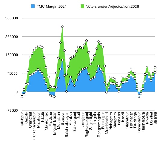 লেখচিত্রের এক্স অক্ষ, অর্থাৎ কিনা বাঁ দিক থেকে ডানদিকে আছে তৃণমূলের ২১ সালের জয়ের ব্যবধান। আর ওয়াই অক্ষ, অর্থাৎ নিচ থেকে উপরে আছে ২৬ সালের বিচারাধীন ভোটারের সংখ্যা। এবং একদম নির্ভুলভাবে, তিনটে জেলা জুড়ে, যেখানে যত মার্জিন বেশি সেখানে তত "বিচারাধীন"।