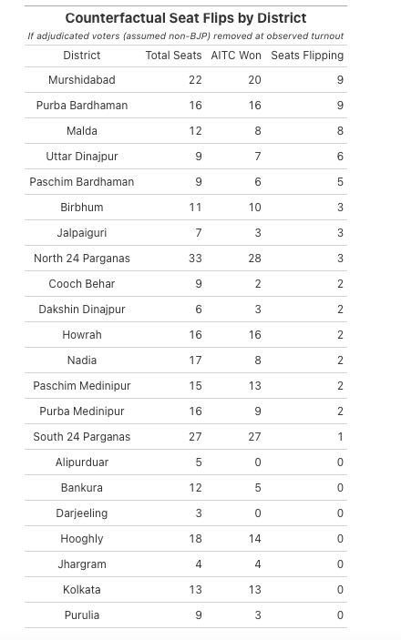 এই পদ্ধতিটা অনুসরণ করে রাজ্যজুড়ে আমরা কী পেয়েছি? এই পদ্ধতির হিসেবে রাজ্যজুড়ে ৫৯ টা আসন ওল্টাবে। অর্থাৎ ৫৯টা আসনে বিচারাধীনের সখ্যা তৃণমূলের মার্জিনের চেয়ে বেশি। সবচেয়ে বেশি ওল্টাচ্ছে মুর্শিদাবাদ, মালদা, পূর্ব বর্ধমান এবং দক্ষিণ দিনাজপুরে। সমস্ত জেলাগুলোর চিত্র ছবি হিসেবে দেওয়া আছে।