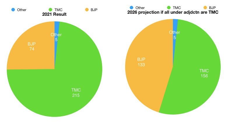 এর ফলে বিধানভার ফলাফল কী হতে পারে? তৃণমূলের আসনসংখ্যা হতে পারে, ১৫৬ ( সংখ্যাগরিষ্ঠতার চেয়ে সামান্য বেশি)। বিজেপির ১৩৩ (সংখ্যাগরিষ্ঠতার চেয়ে সামান্য কম)। সেই ছবিও দেওয়া আছে। (খেয়াল করে দেখবেন, তৃণমূল কিন্তু সংখ্যাগরিষ্ঠতার ধারেকাছেই থাকছে, এবার দল ভেঙে সরকার গড়লে কারো কিছু বলার থাকেনা - মেটিকিউলাস ডিজাইন একেই বলে)
