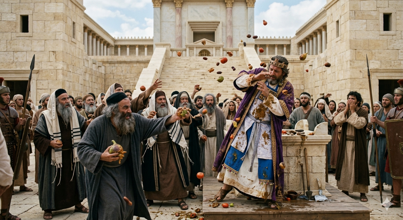 (জেরুসালেমের জিহোভার মন্দিরে বার্ষিক সুকোট উৎসব : হাসমোনিয়ান সম্রাট ইয়ানাইকে ফল ছুঁড়ছেন ফারিসিরা )