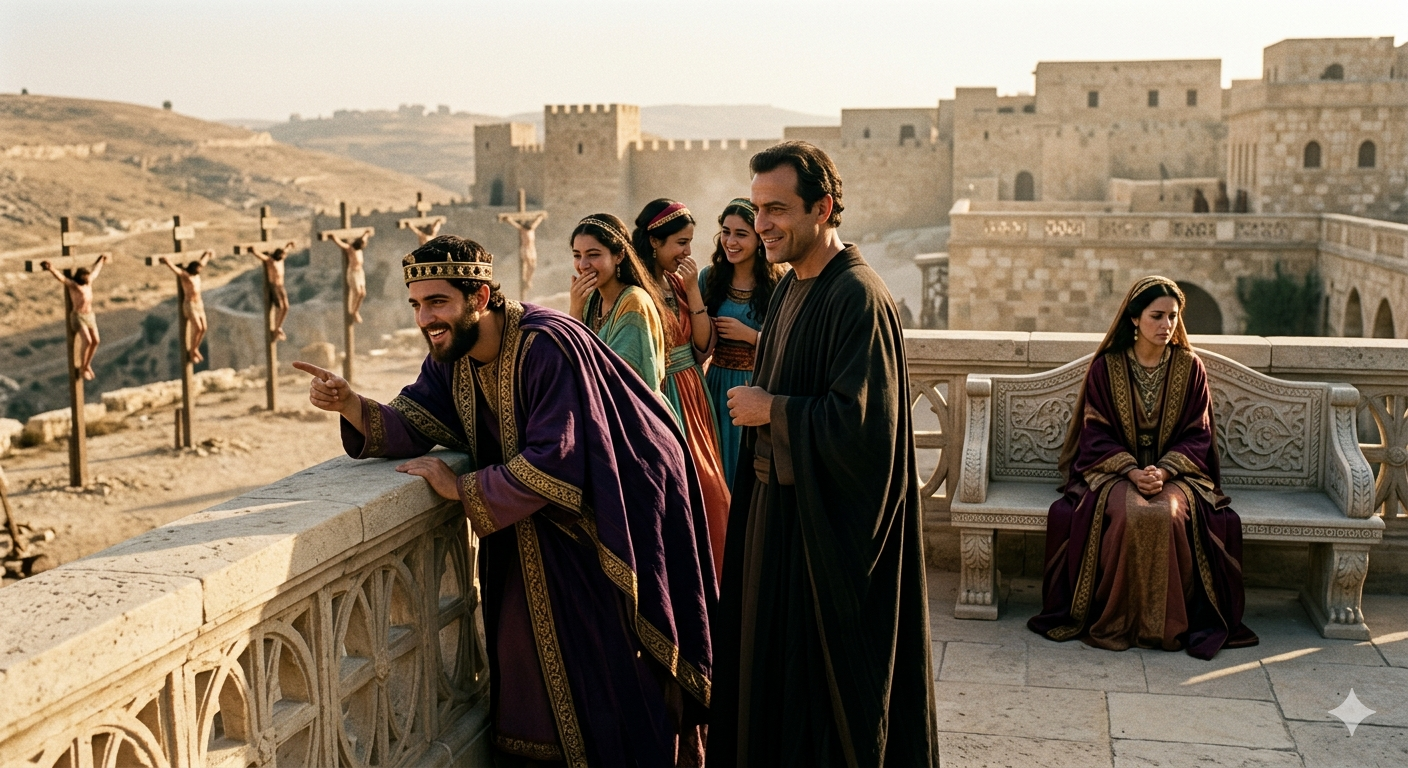(জেরুসালেমের প্রাসাদের ছাদ থেকে ক্রশবিদ্ধ ফারিসীদের দেহগুলোকে দেখে হাসছেন ইয়ানাই, নগরনটীরা আর তার বিশ্বস্ত অ্যান্টিপেটার | দূরে দাঁড়িয়ে বিলাপ করছেন জেরুসালেমের বিবেক সালোমে )