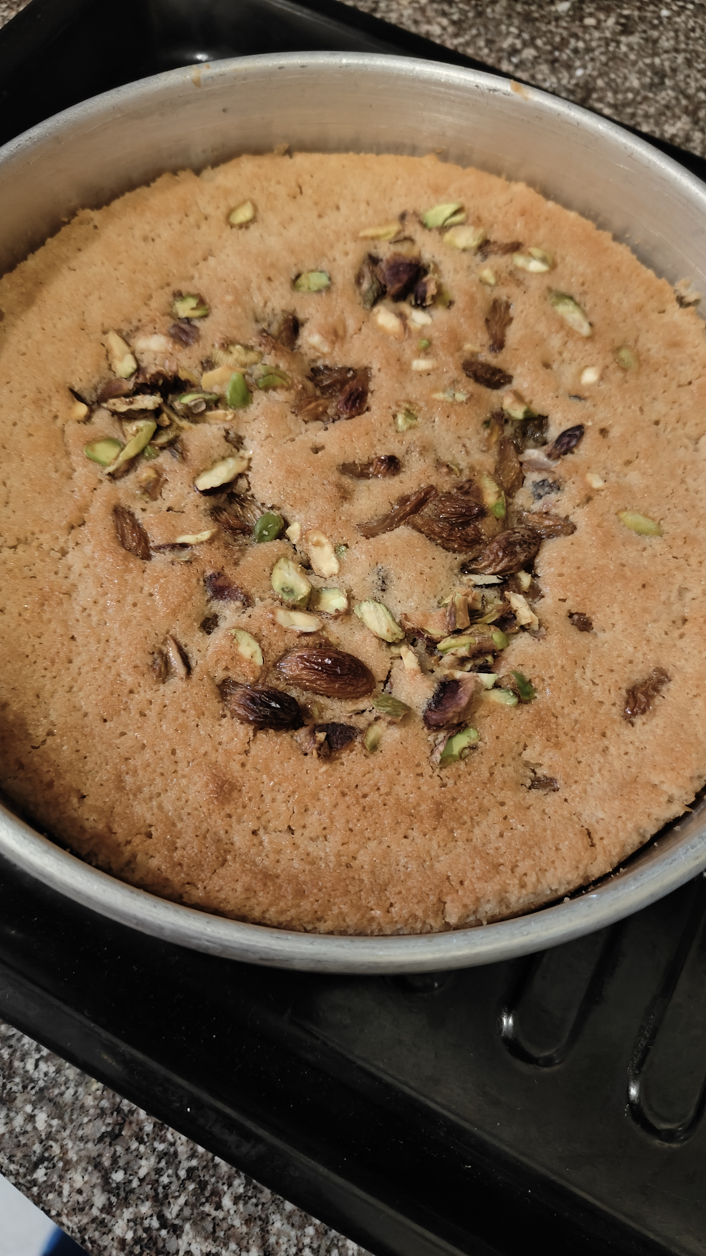 ব্যস, কাজ শেষ, এবার প্যানে ঘি মাখানোর আগে ওভেন প্রি হিট হবে ১৫০ ডিগ্রি সেলসিয়াসে। এর মধ্যেই প্যানে ব্যাটার ঢেলে ইচ্ছেমতো পেস্তা কিশমিশ মিশিয়ে ওভেনে চালান দেওয়া।